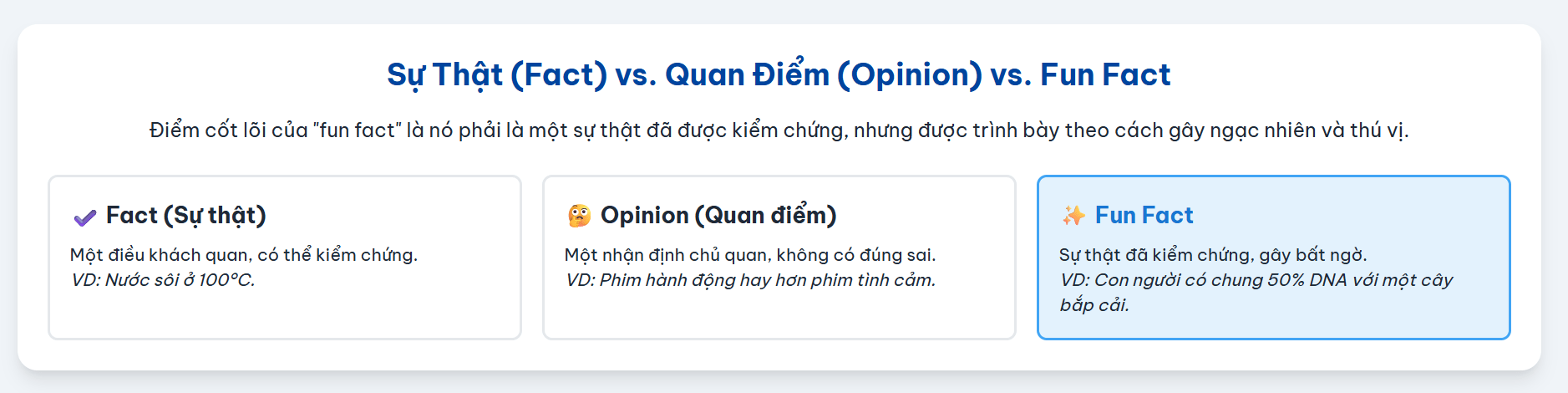 Điểm cốt lõi và quan trọng nhất cần nhấn mạnh là: dù mang yếu tố “fun”, chúng vẫn phải là “fact”. Một “fact” là một điều đã được biết đến hoặc chứng minh là đúng, một sự thật khách quan, có thể kiểm chứng và không phụ thuộc vào ý kiến, cảm xúc hay quan điểm cá nhân.6 Điều này tạo nên sự khác biệt rõ rệt: