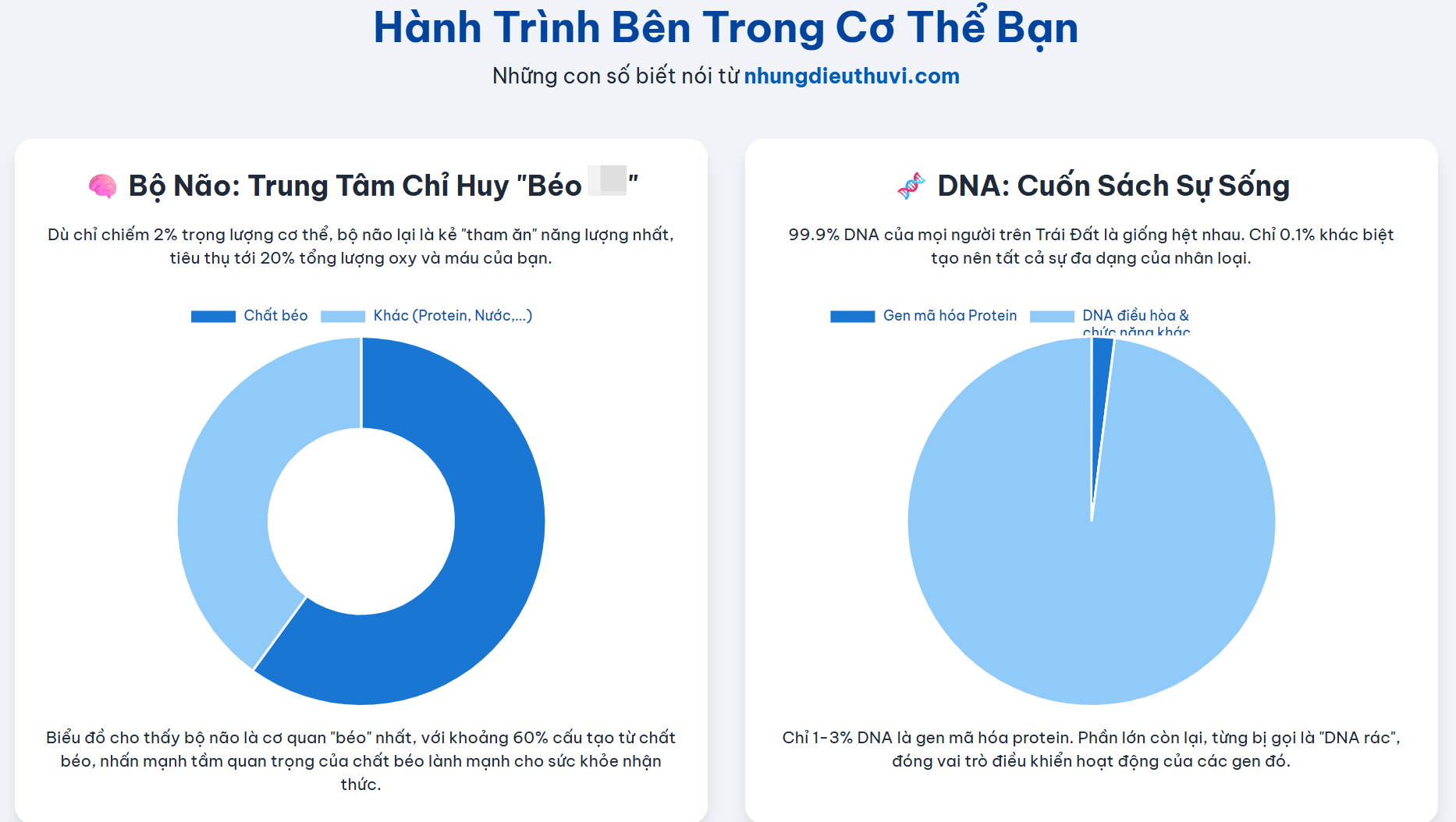 - Fun Fact 4: Hầu hết DNA của bạn không phải là gen. Chỉ khoảng 1-3% DNA của bạn là các gen thực sự mã hóa protein. Khoảng 97-99% còn lại, từng bị gọi một cách sai lầm là “DNA rác” (junk DNA), ngày nay được biết là đóng vai trò cực kỳ quan trọng trong việc điều khiển khi nào và ở đâu các gen đó được bật hay tắt.22