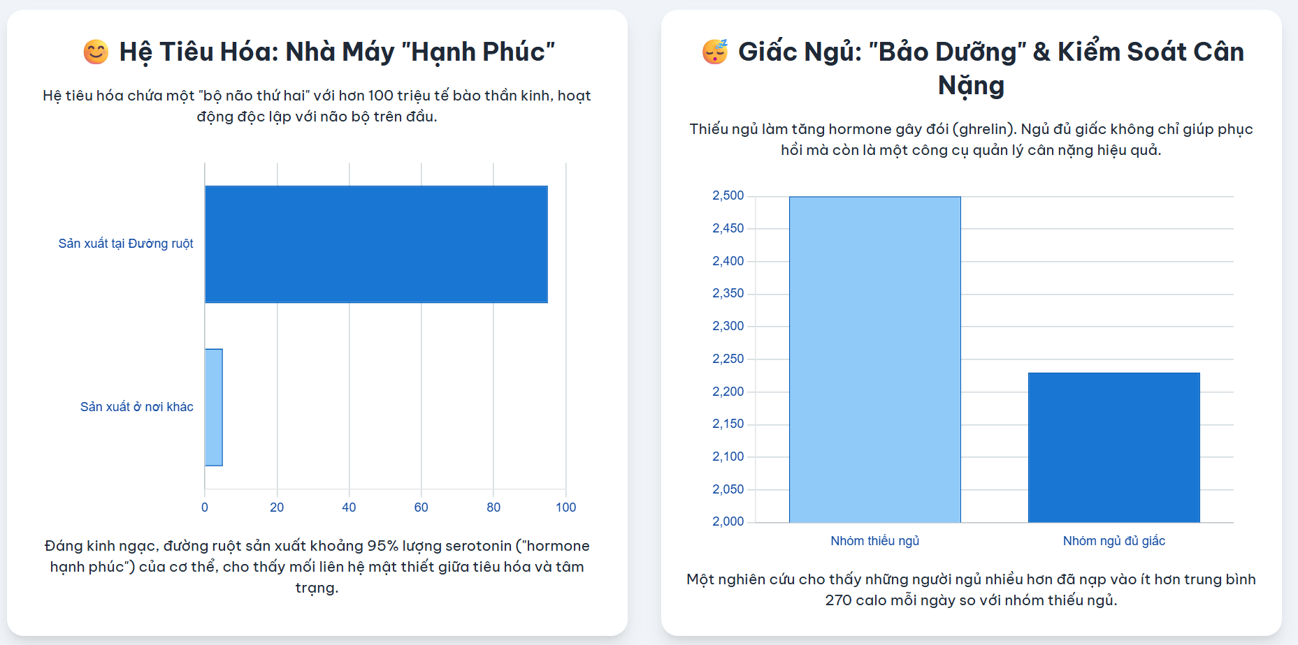 Khái niệm “trục não-ruột” (gut-brain axis) không phải là một ý tưởng mơ hồ mà là một thực tế sinh hóa trực tiếp. Vai trò của ruột với tư cách là nhà sản xuất chính các chất dẫn truyền thần kinh quan trọng như serotonin có nghĩa là sức khỏe tiêu hóa và sức khỏe tinh thần có mối liên hệ không thể tách rời. Điều này định hình lại cách chúng ta nhìn nhận các vấn đề như hội chứng ruột kích thích (IBS) hay chế độ ăn uống kém. Chúng không còn đơn thuần là “vấn đề về dạ dày” mà có thể là tác nhân tiềm ẩn gây ra các rối loạn tâm trạng và lo âu. Do đó, các chiến lược cải thiện sức khỏe tinh thần bắt buộc phải bao gồm cả các biện pháp chăm sóc sức khỏe đường ruột, một kiến thức vô cùng quan trọng để nâng cao chất lượng sống.