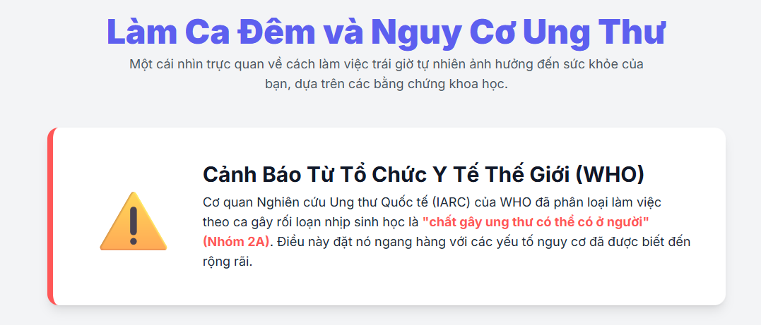 - Làm việc ca đêm gây rối loạn nhịp sinh học, được WHO xếp vào nhóm chất gây ung thư.