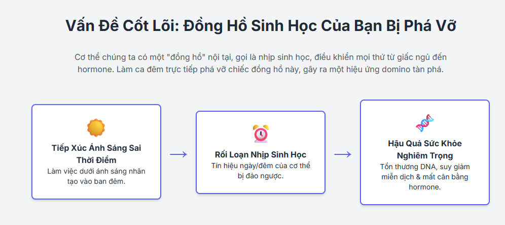 Làm việc ca đêm trực tiếp đảo ngược chu kỳ tự nhiên của cơ thể. Thay vì ngủ trong bóng tối vào ban đêm, người lao động phải tiếp xúc với ánh sáng nhân tạo, đặc biệt là ánh sáng xanh từ đèn điện và thiết bị điện tử. Ánh sáng này ức chế mạnh mẽ quá trình sản xuất melatonin, khiến cơ thể khó nhận biết được đã đến lúc nghỉ ngơi. Ngược lại, việc cố gắng ngủ vào ban ngày lại gặp phải các yếu tố gây nhiễu như tiếng ồn, ánh sáng và nhiệt độ, làm giảm chất lượng giấc ngủ.