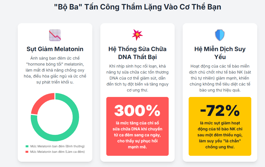 ức chế cơ chế sửa chữa DNA, làm cho chúng nhạy cảm hơn với các phương pháp điều trị ung thư như hóa trị và xạ trị. Do đó, sự thiếu hụt melatonin do làm ca đêm không chỉ làm tăng nguy cơ tổn thương DNA mà còn làm suy yếu khả năng tự vệ của cơ thể chống lại sự phát triển của tế bào ung thư. - Ảnh hưởng trực tiếp đến gen đồng hồ sinh học và sửa chữa DNA: Các nghiên cứu chuyên sâu đã chỉ ra rằng sự gián đoạn nhịp sinh học ảnh hưởng trực tiếp đến hoạt động của các gen điều hòa đồng hồ sinh học cốt lõi như CLOCK, BMAL1, PER và CRY. Những gen này không chỉ kiểm soát chu kỳ ngủ-thức mà còn đóng vai trò quan trọng trong việc điều hòa chu kỳ tế bào, quá trình chết theo chương trình (apoptosis – loại bỏ tế bào bị lỗi) và đặc biệt là các con đường phản ứng với tổn thương DNA (DNA Damage Response – DDR). Chẳng hạn, các protein CRY có cấu trúc liên quan đến enzym sửa chữa DNA. Protein PER1 và TIM trực tiếp tương tác với các protein quan trọng trong quá trình sửa chữa DNA như ATM và CHK2, giúp kiểm soát sự dừng chu kỳ tế bào khi có tổn thương. Khi nhịp sinh học bị rối loạn, sự biểu hiện và chức năng của các gen đồng hồ này bị ảnh hưởng, làm suy yếu khả năng nhận diện và sửa chữa tổn thương DNA của tế bào. Điều này dẫn đến sự tích tụ các lỗi di truyền, tạo điều kiện thuận lợi cho sự phát triển của các tế bào bất thường và cuối cùng là ung thư. Một nghiên cứu đã chứng minh rằng những người làm ca đêm sản xuất ít hơn 8-OH-dG, một sản phẩm phụ hóa học của quá trình sửa chữa DNA. Khi những người này chuyển sang làm ca ngày, mức độ 8-OH-dG tăng lên tới 300%, cho thấy khả năng sửa chữa DNA của cơ thể hoạt động kém hiệu quả hơn đáng kể trong ca đêm.
