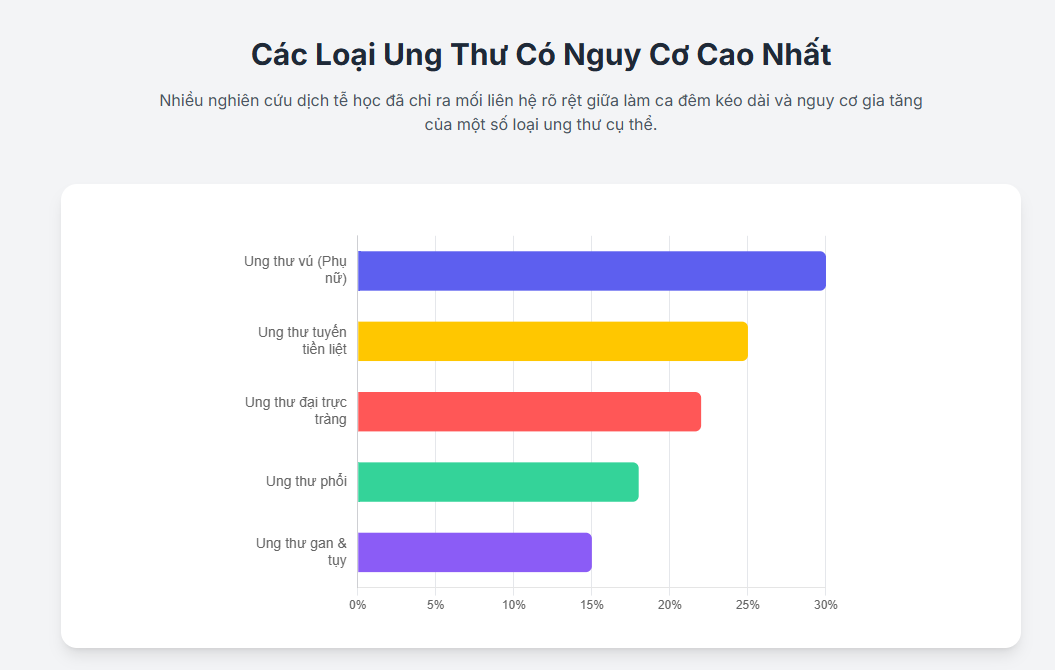 - Ung thư vú: Đây là loại ung thư được nghiên cứu nhiều nhất và có mối liên hệ mạnh mẽ nhất với làm việc ca đêm. Nhiều nghiên cứu dịch tễ học đã chỉ ra rằng phụ nữ làm việc ca đêm kéo dài, đặc biệt là trên 20 năm, có nguy cơ mắc ung thư vú cao hơn đáng kể. Điều này cho thấy mối liên hệ có tính chất tích lũy, tức là nguy cơ tăng lên theo thời gian và mức độ tiếp xúc với sự gián đoạn nhịp sinh học.