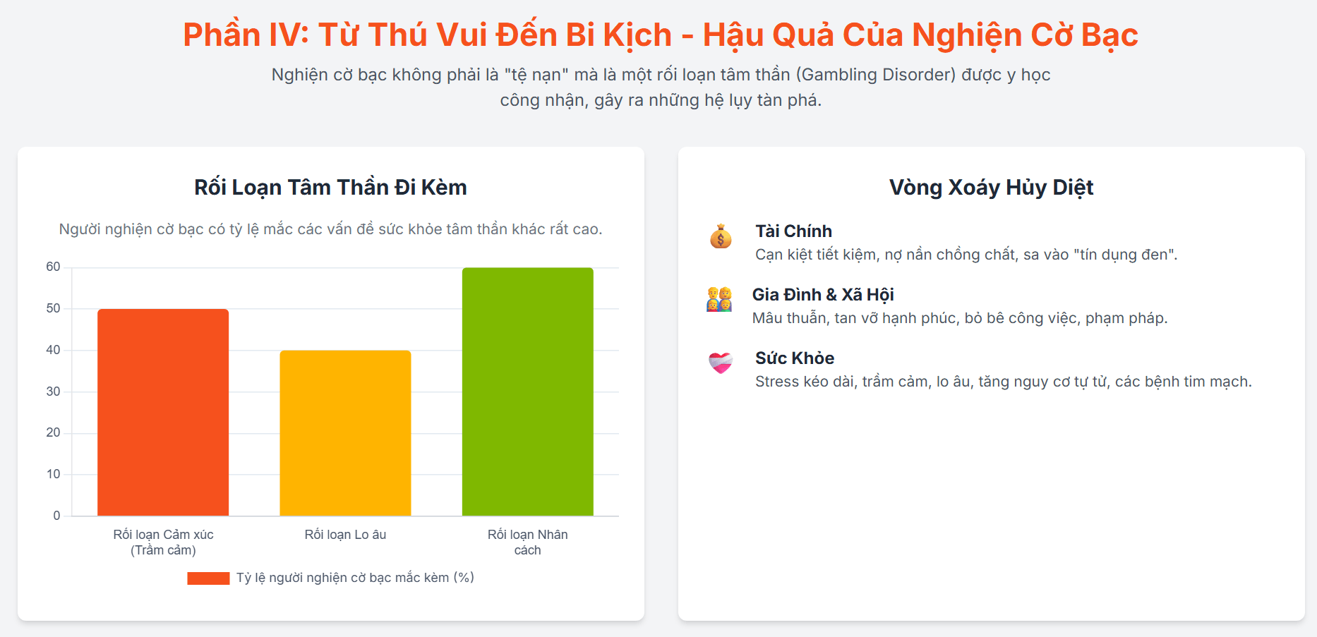 - Sức khỏe Tâm thần và Thể chất: Nghiện cờ bạc hiếm khi tồn tại một mình. Nó thường đi kèm với một loạt các rối loạn tâm thần khác. Thống kê cho thấy hơn 50% người nghiện cờ bạc có rối loạn cảm xúc (như trầm cảm), khoảng 40% có các biểu hiện của rối loạn lo âu, và trên 60% mắc rối loạn nhân cách.27 Nguy cơ tự tử ở nhóm đối tượng này cũng cao hơn đáng kể so với dân số chung. Về mặt thể chất, tình trạng stress, căng thẳng, lo âu và mất ngủ kéo dài có thể dẫn đến nhiều vấn đề sức khỏe nghiêm trọng như đau nửa đầu, rối loạn tiêu hóa, tăng huyết áp, các bệnh lý tim mạch và suy nhược cơ thể.20
