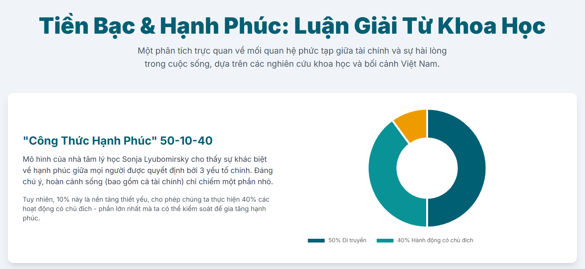 Vậy dưới lăng kính khoa học, mối quan hệ này thực sự là gì? Tài chính chiếm bao nhiêu phần trăm trong “công thức” hạnh phúc của con người nói chung và gia đình Việt Nam nói riêng? Để trả lời thỏa đáng những câu hỏi này, người biên tập Những điều thú vị đã tổng hợp thông tin từ các nghiên cứu tâm lý học, kinh tế học hành vi và khoa học thần kinh để mang đến một bức tranh toàn diện và sâu sắc.