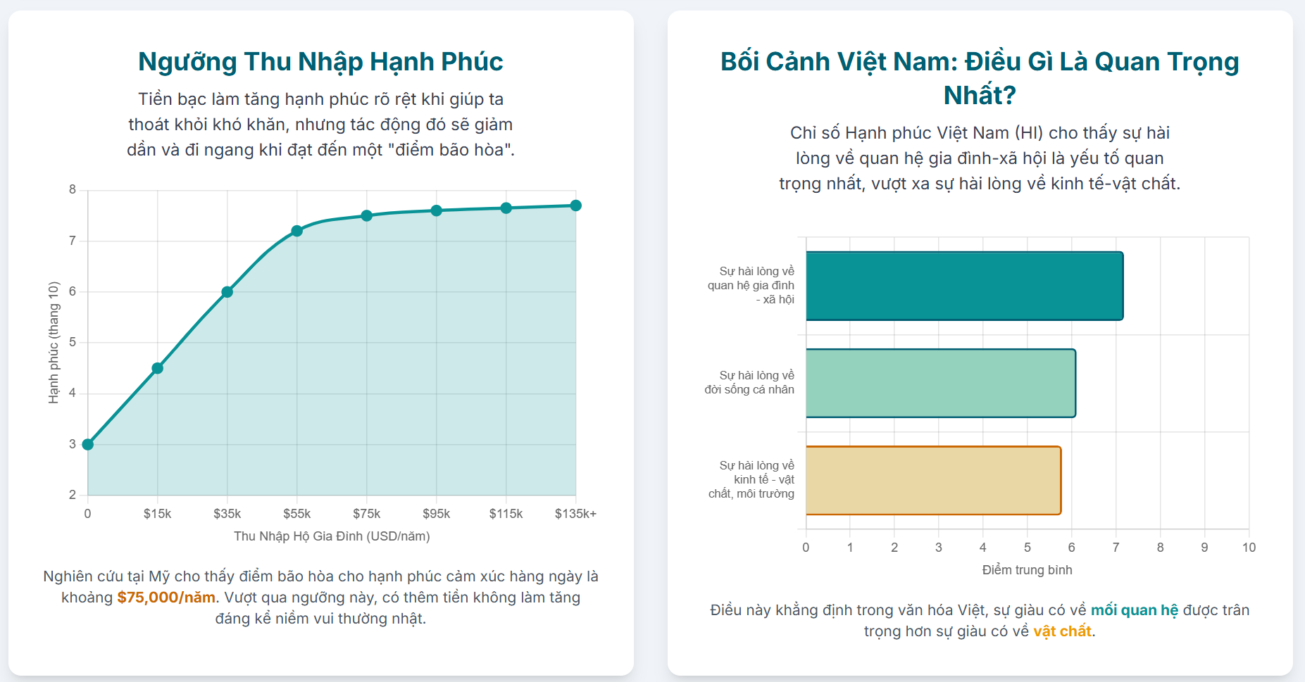 Nếu các nghiên cứu toàn cầu chỉ ra một bức tranh chung, thì bối cảnh văn hóa – xã hội đặc thù của Việt Nam lại mang đến những góc nhìn riêng biệt và sâu sắc về mối quan-hệ-kép giữa tiền bạc và hạnh phúc.