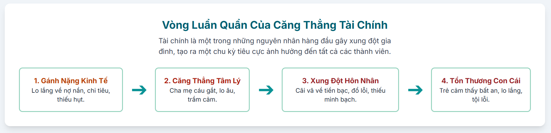 Theo một khảo sát của Viện Tâm lý học Việt Nam, có đến 60% các cặp đôi gặp mâu thuẫn vì tiền bạc, và hơn 1/3 trong số đó cho biết đây là nguyên nhân chính dẫn đến ly hôn.26 Căng thẳng tài chính (financial stress) tạo ra một vòng luẩn quẩn độc hại: