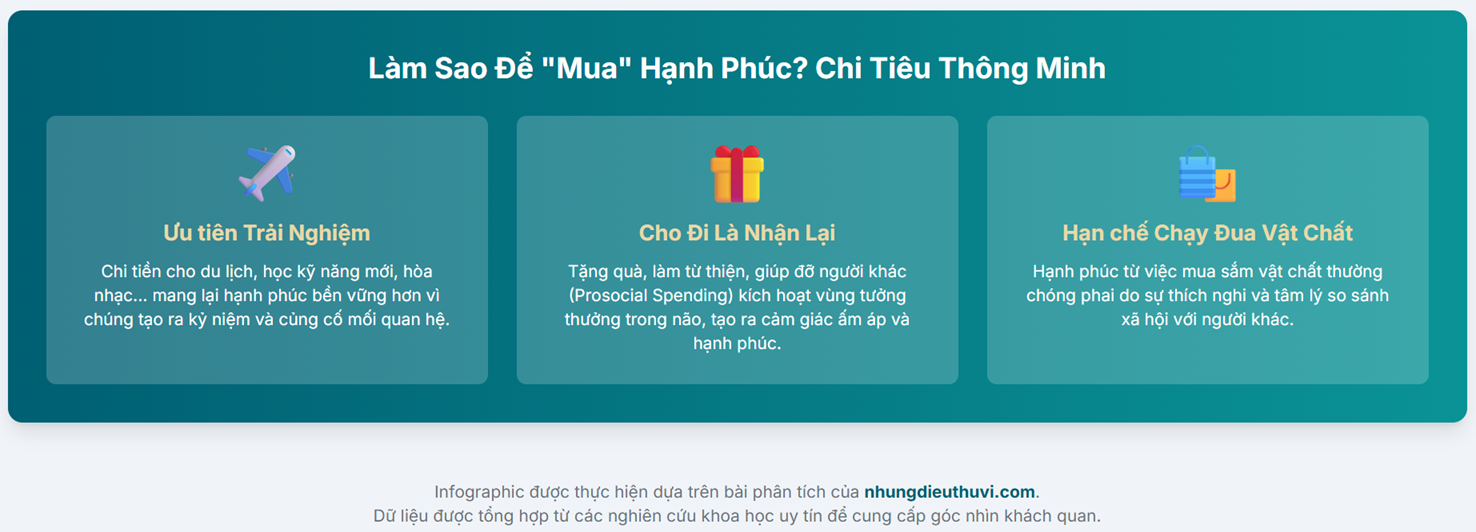 Nhiều nghiên cứu từ các đại học danh tiếng như Cornell, San Francisco State đã khẳng định rằng chi tiền cho trải nghiệm (du lịch, học một kỹ năng mới, đi xem hòa nhạc, ăn tối cùng người thân) mang lại hạnh phúc lâu dài và sâu sắc hơn nhiều so với việc mua sắm vật chất (quần áo hàng hiệu, điện thoại mới).33