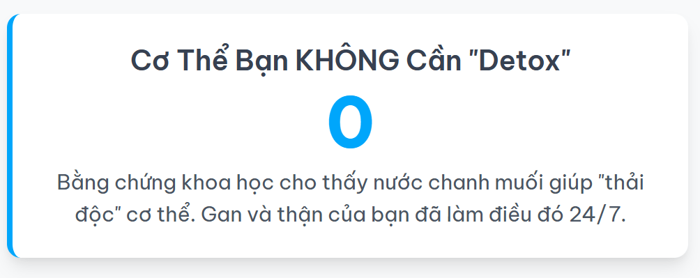 - Tuyên bố “Detox”: Hoàn toàn không có cơ sở khoa học. Cơ thể tự thải độc thông qua gan và thận. Nước chanh muối không tăng cường quá trình này.8