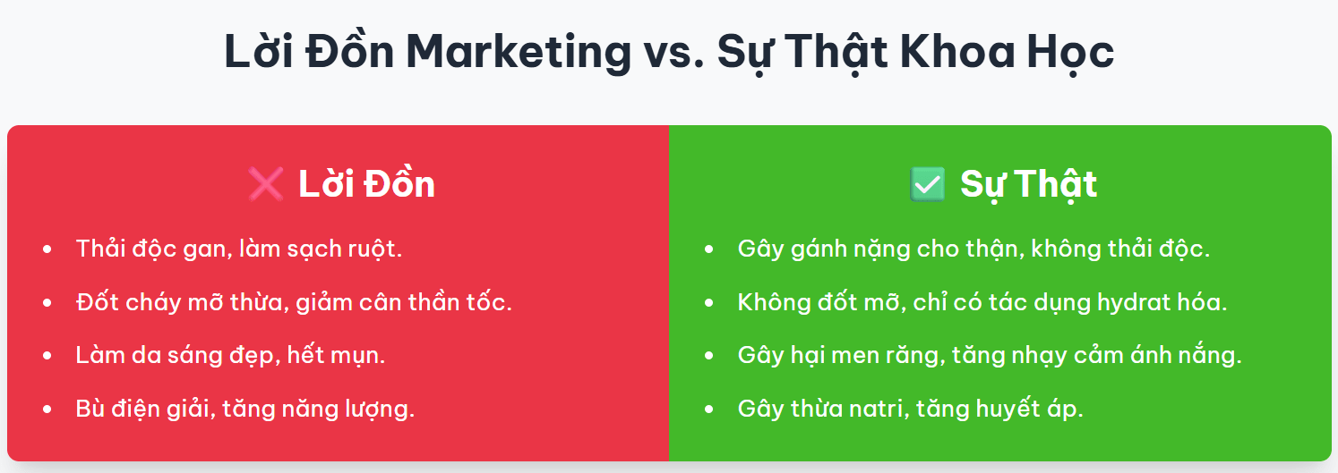 | Bổ sung điện giải & Hydrat hóa: Cung cấp khoáng chất, bù nước. | Thực tế: Chỉ có lợi trong trường hợp mất nước nghiêm trọng (sau tập luyện nặng). Rủi ro: Gây thừa natri ở người bình thường, dẫn đến tăng huyết áp, phù nề và các vấn đề tim mạch.23 | |