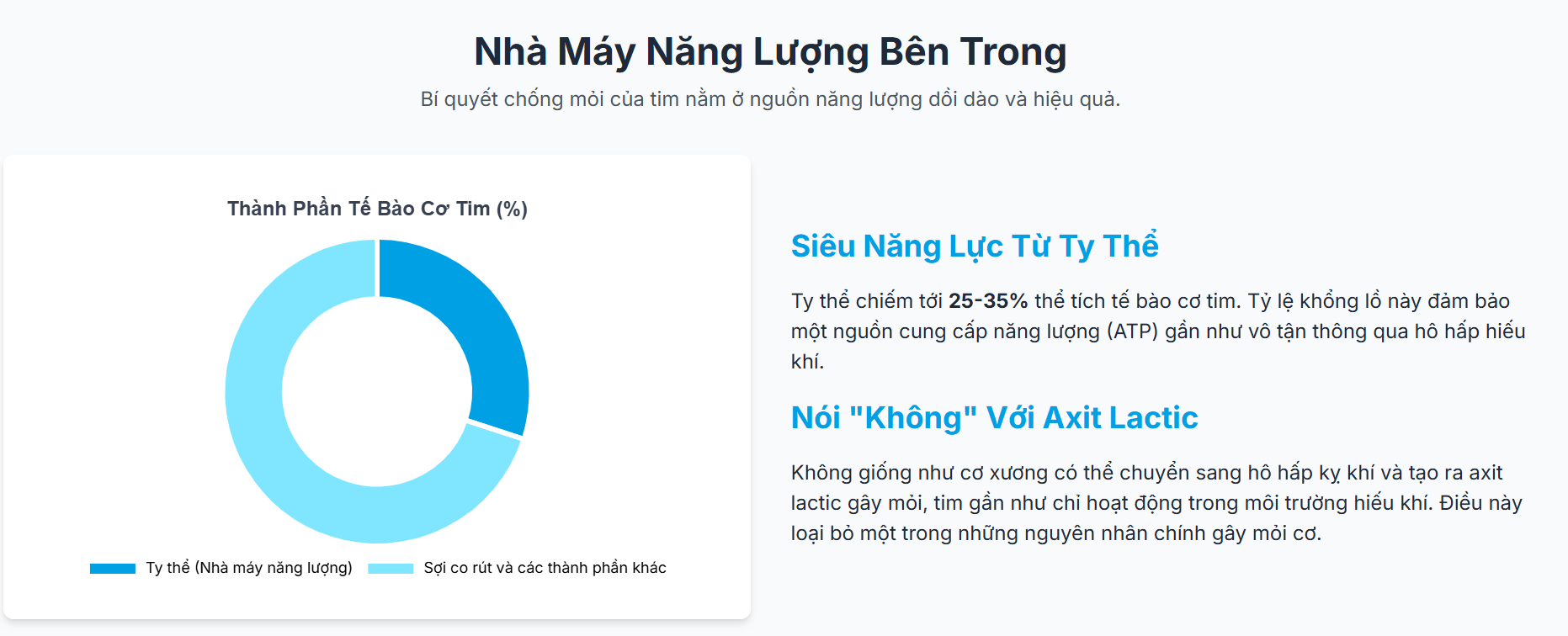 - Cơ tim có cấu trúc và nguồn năng lượng chuyên biệt, giúp nó chống lại sự mỏi mệt.