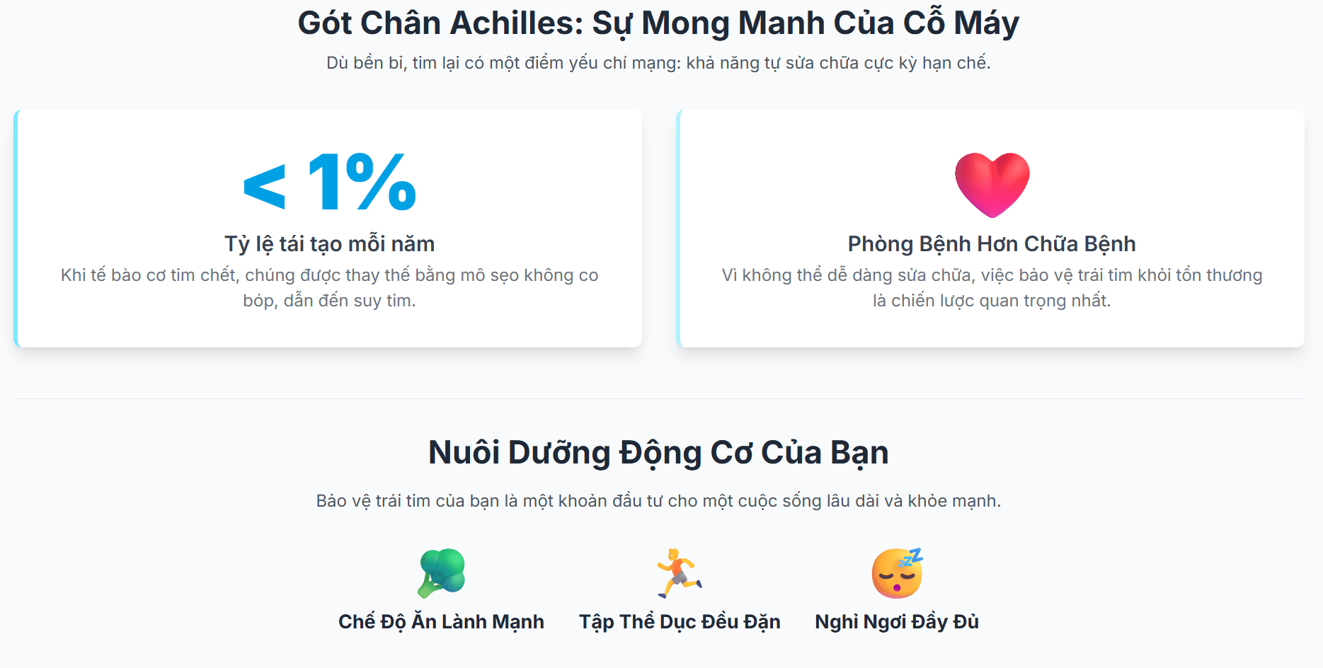 - Khả năng tự sửa chữa của tim rất hạn chế, khiến việc phòng bệnh trở nên tối quan trọng.