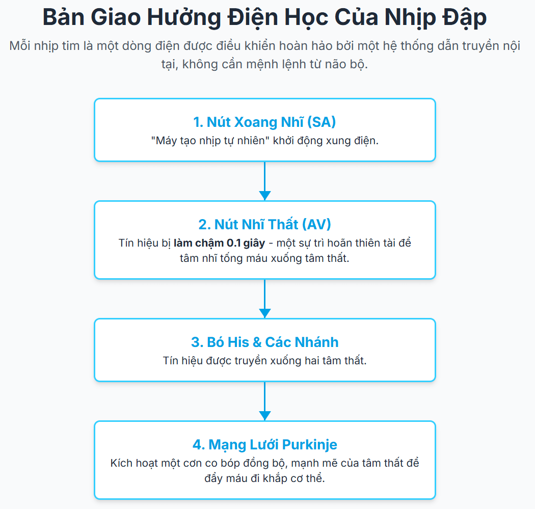 Trái tim không cần bộ não ra lệnh cho từng nhịp đập. Nó sở hữu một hệ thống điều khiển nội tại, một “nhạc trưởng” và “dàn nhạc” riêng, được tạo thành từ các tế bào cơ tim chuyên biệt có khả năng tạo và dẫn truyền tín hiệu điện.16